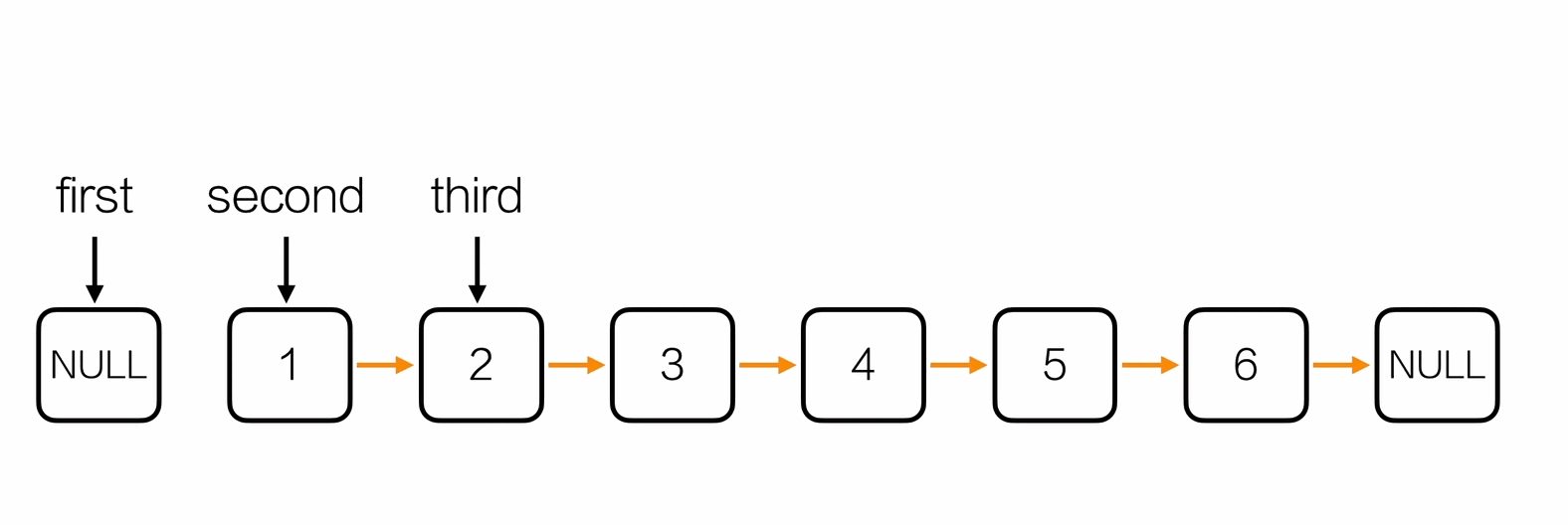 Node * reverseList(Node *head){ Node *first = NULL; Node *second = head->next; Node *third;